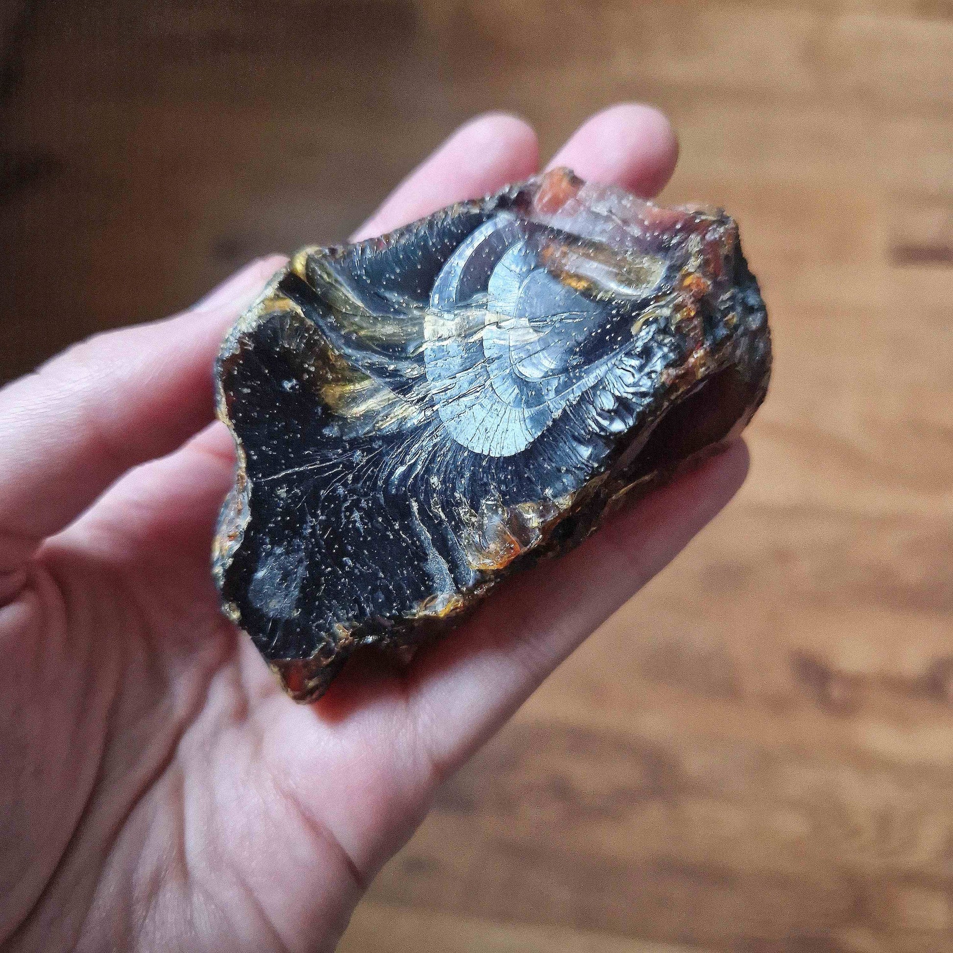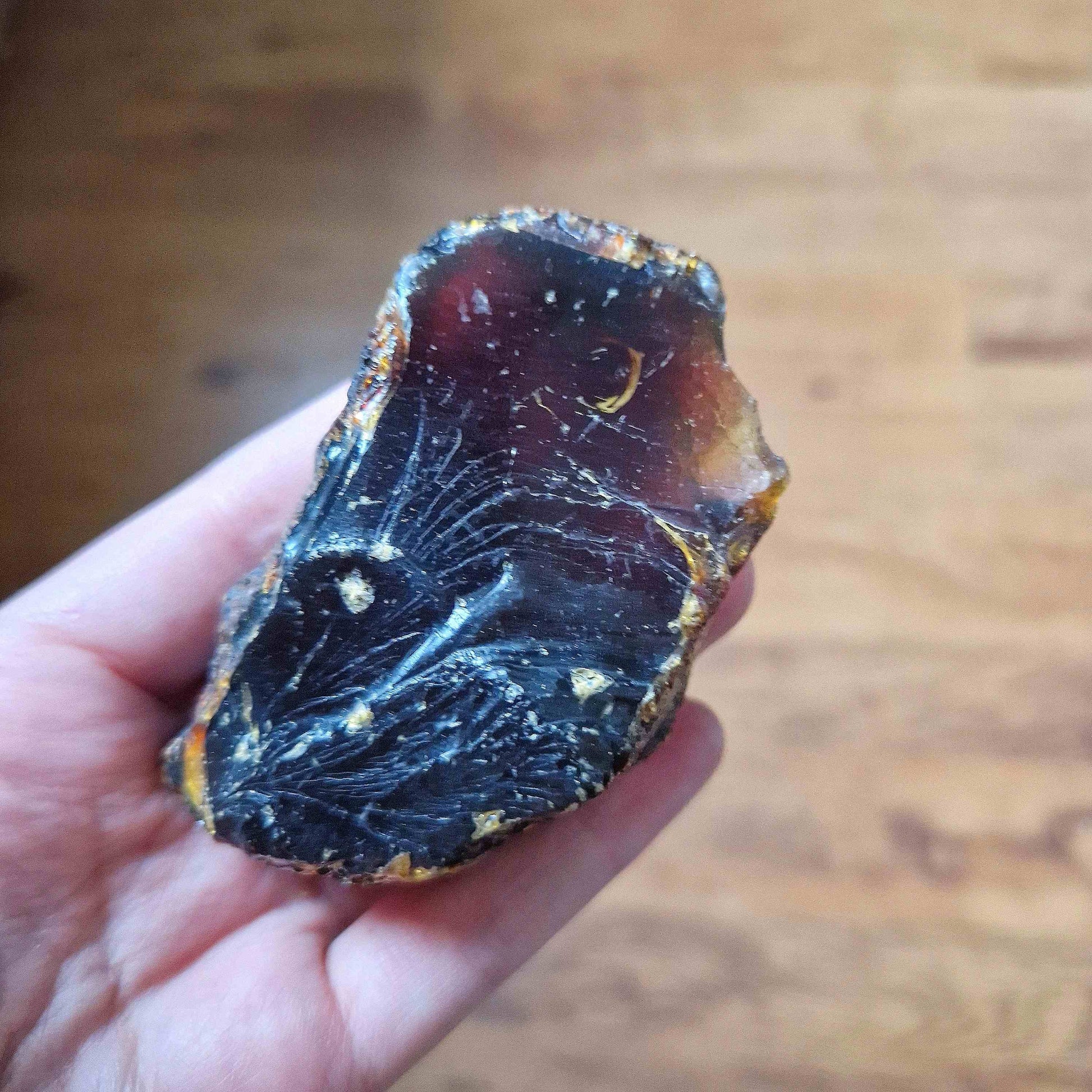 L'Ambre est une gemme très tendre, à faible dureté. C'est une résine fossile vieille de 50 millions d'année : elle n'a pas de structure cristalline. Son nom grec, "élektron", est le mot pour désigner l'électricité, ce qui montre qu'elle a un lien très important avec celle ci.