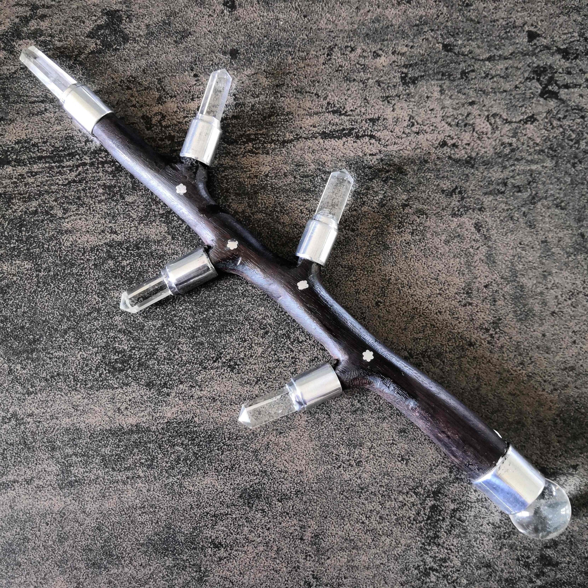 Cette baguette en bois de rose avec cristal de roche permet de canaliser l'énergie et d'amplifier le travail du praticien ou du thérapeute.