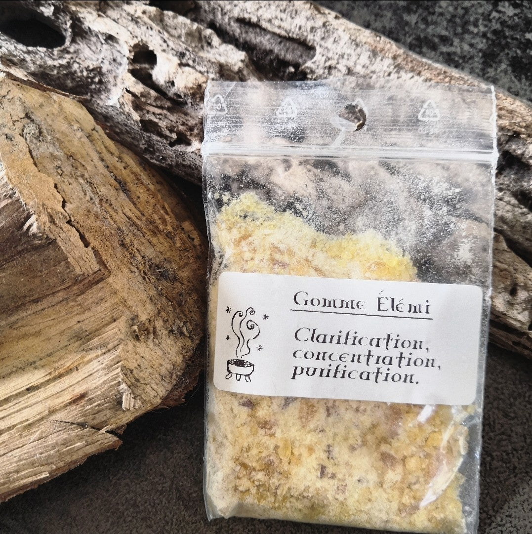 La gomme Élémi aide à nous concentrer sur nos objectifs et à nous donner la force nécessaire à leurs réalisations. Elle permet de clarifier les situations et dissiper les malentendus, de purifier les lieux des énergies stagnantes. Elle était utilisée en Égypte pour la momification. Elle provient d'Amérique du Sud.