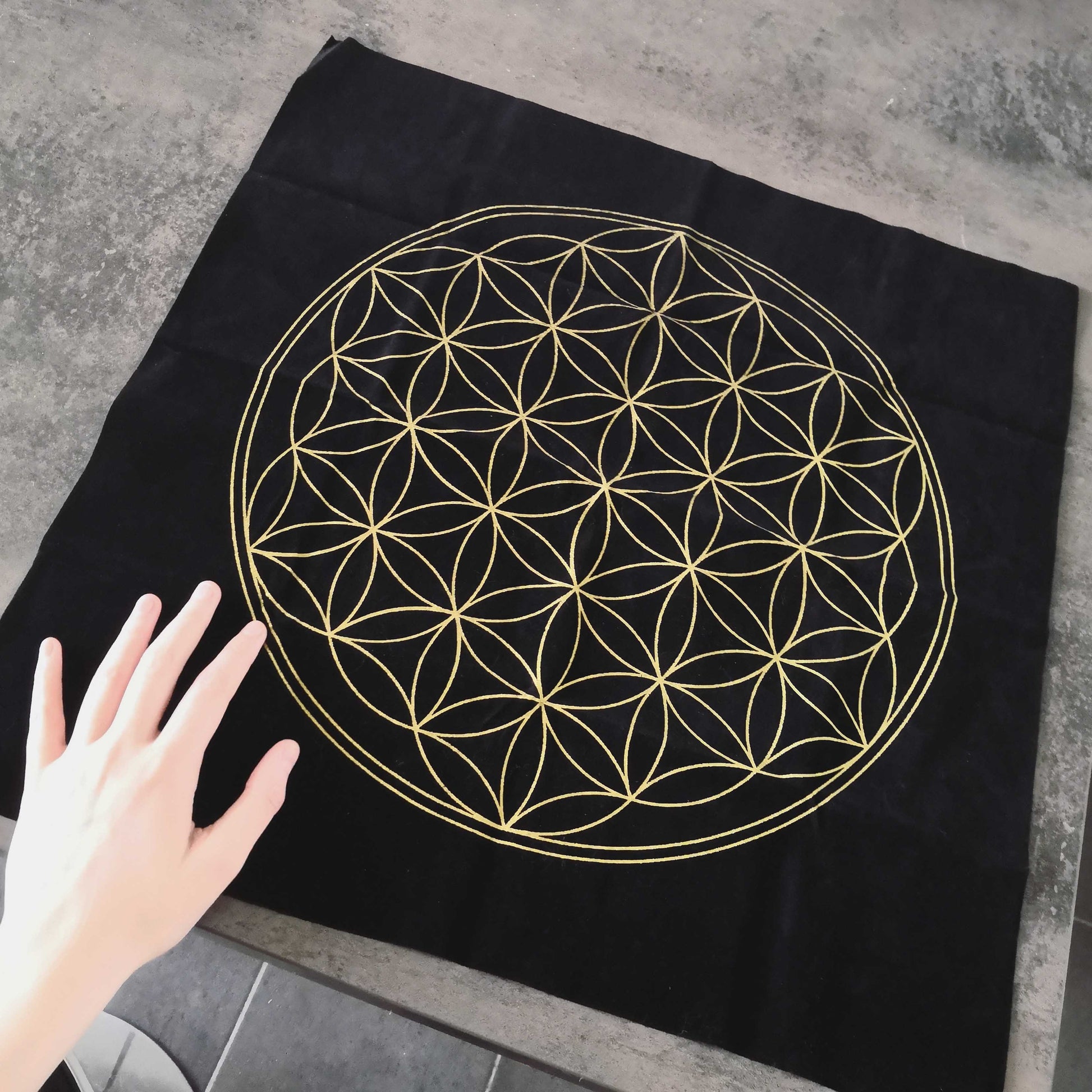 Nappe carrée en tissu de velours noir avec une fleur de vie dorée imprimée - 50 cm x 50 cm - Elle peut être un support pour la divination (tirage de cartes, etc.), la purification des pierres, les grilles de cristaux, un support d'autel, ...