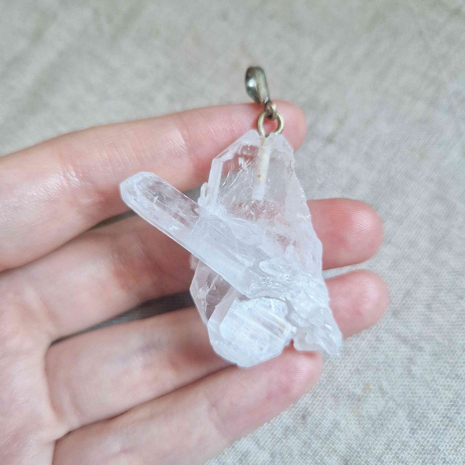 Ce pendentif est un quartz à âme : c'est un cristal tabulaires (c'est-à-dire plat) contrairement à tous les autres cristaux de quartz qui sont colomnaires (ils se forment en colonnes).